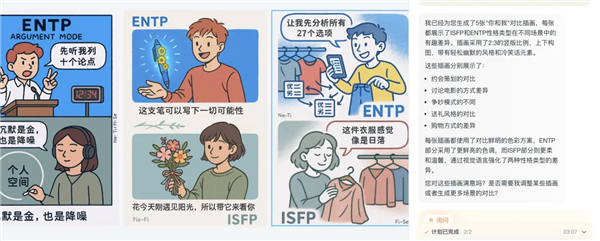 此次我 prompt 只写下「一系列插画漫画、画面尺寸、内容标的目的(分歧 MBTI 情侣的交换错位)、中文文本」。熬个大夜也能做完。设想次要是沟通成本。我特地强调消息要用中文,
